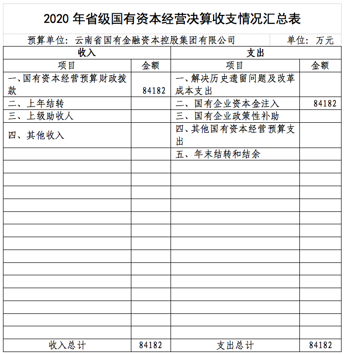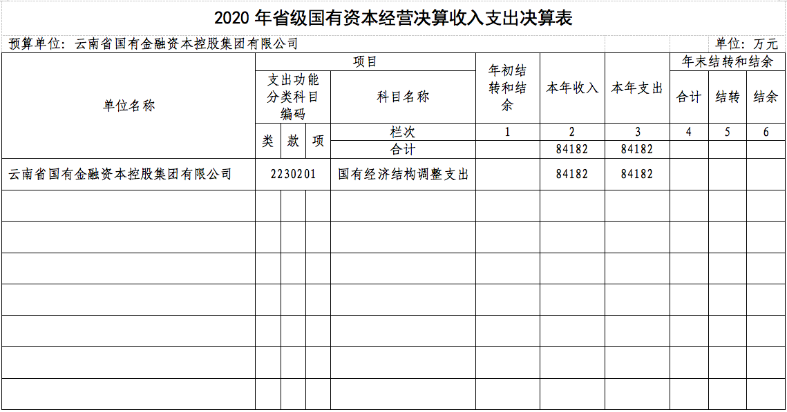 根據(jù)《云南省財政廳關(guān)于2020年度國有資本經(jīng)營決算的批復(fù)》(云財資〔2021〕81號)要求,現(xiàn)將我公司2020年國有資本經(jīng)營決算情況公示如下: