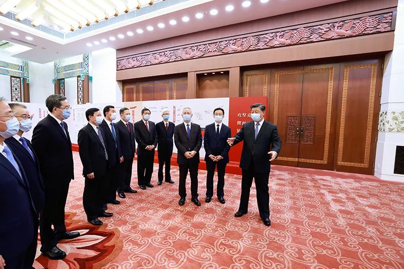 9月30日,黨和國家領導人習近平、韓正等在北京人民大會堂會見C919大型客機項目團隊代表并參觀項目成果展覽。這是習近平等參觀項目成果展覽。新華社記者 丁林 攝
