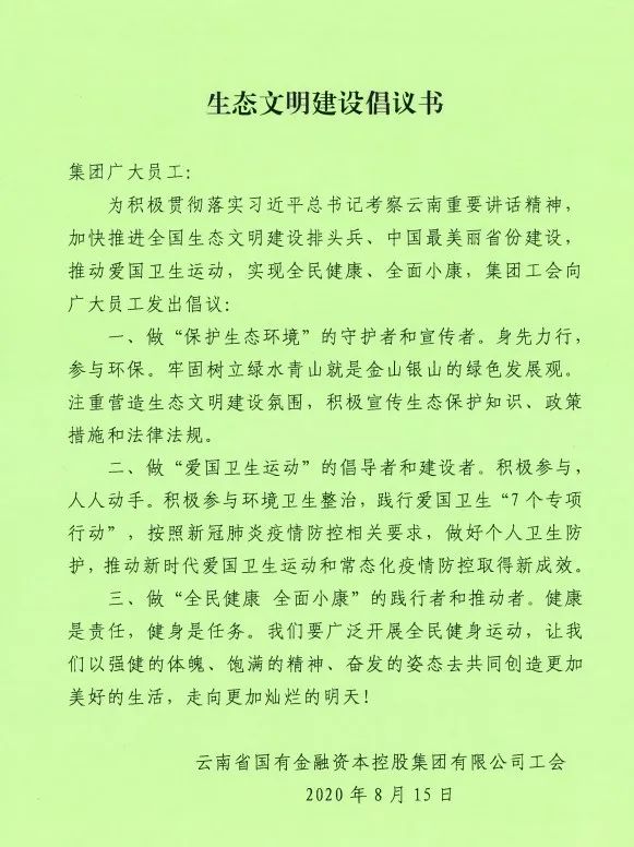 ?今后,集團工會將持續(xù)開展內(nèi)容豐富、形式多樣的文體活動,進一步鼓勵和引導(dǎo)廣大員工積極貫徹落實習(xí)近平總書記考察云南講話精神,推進生態(tài)文明建設(shè),以強健的體魄和飽滿的精神切實履行好集團“服務(wù)實體經(jīng)濟、深化金融改革、防控金融風(fēng)險”三大使命任務(wù),加強國有金融資本集中統(tǒng)一管理、不斷優(yōu)化國有金融資本布局結(jié)構(gòu)的實際成效,推動集團高質(zhì)量穩(wěn)健發(fā)展,為全省決戰(zhàn)脫貧攻堅、決勝全面建成小康社會作出應(yīng)有貢獻。