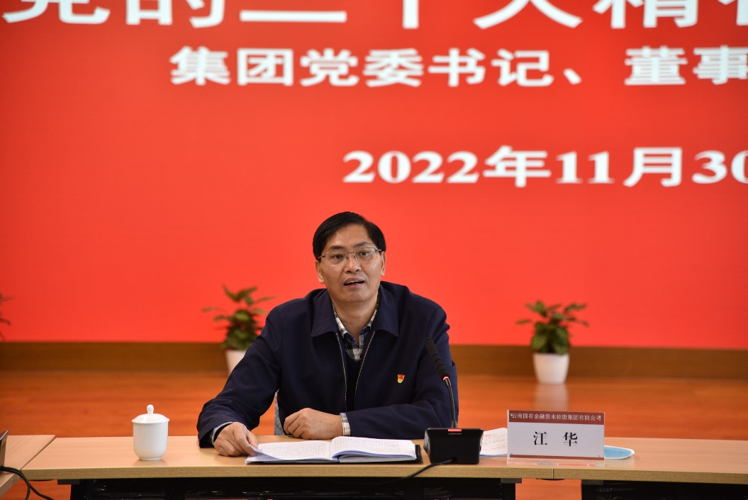 ?11月30日,云南金控集團黨委書記、董事長江華到集團下屬融擔公司宣講黨的二十大精神。集團相關部門領導,融擔公司領導班子成員、中層管理人員、高級業(yè)務經理和各支部黨員代表參加了會議。