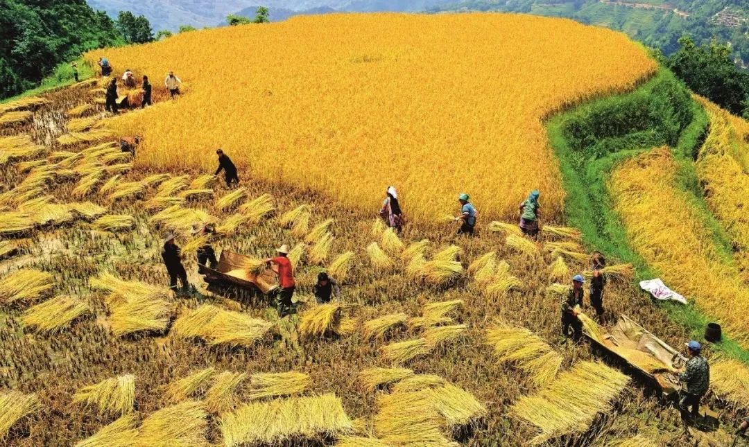 △ 云南省紅河哈尼族彝族自治州元陽縣梯田紅米喜獲豐收。