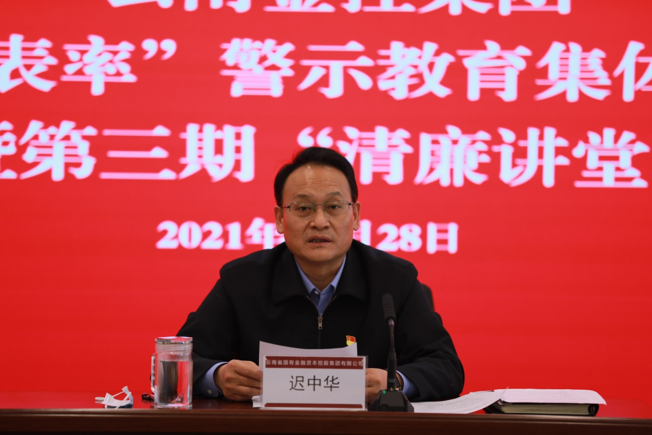 ? 云南金控集團(tuán)黨委認(rèn)真貫徹落實(shí)省委“五個(gè)作表率”專題學(xué)習(xí)教育工作要求,把開展以案促改警示教育和集體廉政談話作為落實(shí)“五個(gè)作表率”專題學(xué)習(xí)教育的具體行動(dòng)和重要抓手,持續(xù)構(gòu)建云南金控風(fēng)清氣正的政治生態(tài)。2021年12月28日,集團(tuán)黨委組織集團(tuán)領(lǐng)導(dǎo)班子成員、集團(tuán)中層管理人員開展“五個(gè)作表率”警示教育集體廉政談話暨第三期“清廉講堂”活動(dòng)。