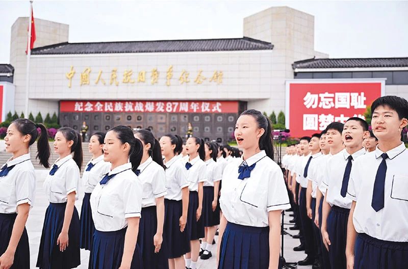 1937年7月7日,日本侵略軍悍然發(fā)動(dòng)盧溝橋事變(七七事變),當(dāng)?shù)刂袊?guó)駐軍奮起抵抗,全民族抗戰(zhàn)由此爆發(fā)。圖為2024年7月7日,首都學(xué)生代表參加在北京中國(guó)人民抗日戰(zhàn)爭(zhēng)紀(jì)念館舉行的紀(jì)念全民族抗戰(zhàn)爆發(fā)87周年儀式。 新華社記者 李響/攝