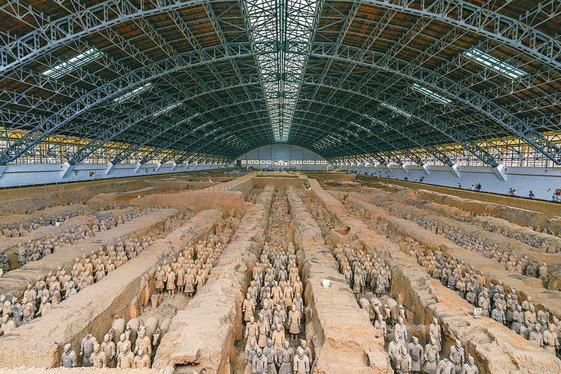 秦始皇陵是中國歷史上第一個(gè)多民族的中央集權(quán)國家的皇帝秦始皇于公元前246年至公元前208年?duì)I建的。作為秦始皇陵陪葬墓坑之一的兵馬俑坑于1974年被發(fā)現(xiàn),被譽(yù)為“世界第八大奇跡”。圖為秦始皇兵馬俑博物館一號坑全景。人民圖片 丁俊豪/攝