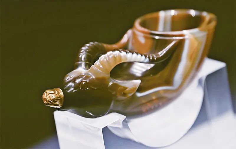 鑲金獸首瑪瑙杯的造型,與起源于古希臘的酒具“來通”相似,“來通”曾廣泛流行于中亞、西亞地區(qū),沿著絲綢之路不斷東傳進入中國,讓我們見證兩千余年來中華文明與絲綢之路沿線各國經(jīng)濟、文化交流的悠久歷史。圖為在陜西歷史博物館展出的鑲金獸首瑪瑙杯。新華社記者 李一博/攝