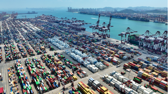 青島海關(guān)數(shù)據(jù)顯示,今年1月至5月,青島直達(dá)金磚國家的航線共完成箱量83萬標(biāo)箱,同比增長12%,其中出口量增長26.1%。圖為繁忙的山東港口青島港前灣港區(qū),集裝箱貨輪在裝卸集裝箱(6月15日攝,無人機(jī)照片)。新華社記者 李紫恒 /攝