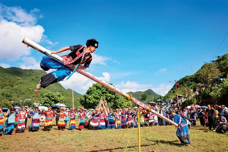 2023年8月10日是彝族傳統(tǒng)節(jié)日火把節(jié),廣西百色市隆林各族自治縣德峨鎮(zhèn)阿搞屯的村民在取火祭火、祭送布谷鳥(niǎo)、打磨秋、抹黑臉、篝火晚會(huì)等民族特色活動(dòng)中歡慶節(jié)日、傳遞祝福。圖為村民展示彝族傳統(tǒng)習(xí)俗——打磨秋。 新華社記者 胡星宇/攝