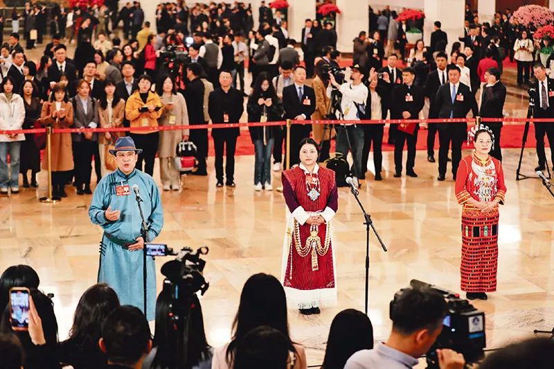 2025年3月10日,全國政協(xié)十四屆三次會議第三場“委員通道”在人民大會堂舉行。圖為少數(shù)民族委員亮相“委員通道”。?民族畫報(bào)記者 康夢婷/攝