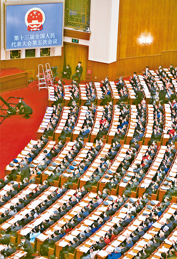 黨的十八大以來,人民代表大會制度不斷完善。圖為2022年3月8日,十三屆全國人大五次會議在北京人民大會堂舉行第二次全體會議?!⌒氯A社記者 金立旺/攝