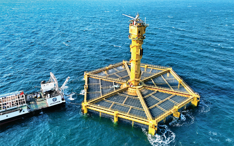 近年來,我國(guó)在一些共性技術(shù)研發(fā)創(chuàng)新上不斷取得突破。圖右側(cè)為我國(guó)自主研制的大型全潛式深海智能漁業(yè)養(yǎng)殖裝備——“深藍(lán)2號(hào)”(2025年1月12日攝,無人機(jī)照片)。新華社記者 李紫恒/攝