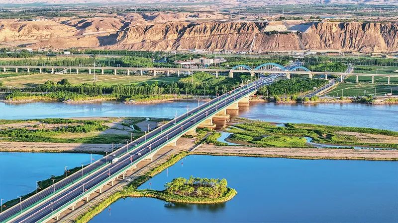 圖為2023年6月13日,位于寧夏中衛(wèi)的黃河公路大橋、黃河鐵路大橋與黃河濕地交相輝映,美麗如畫。 人民圖片 柴更利/攝