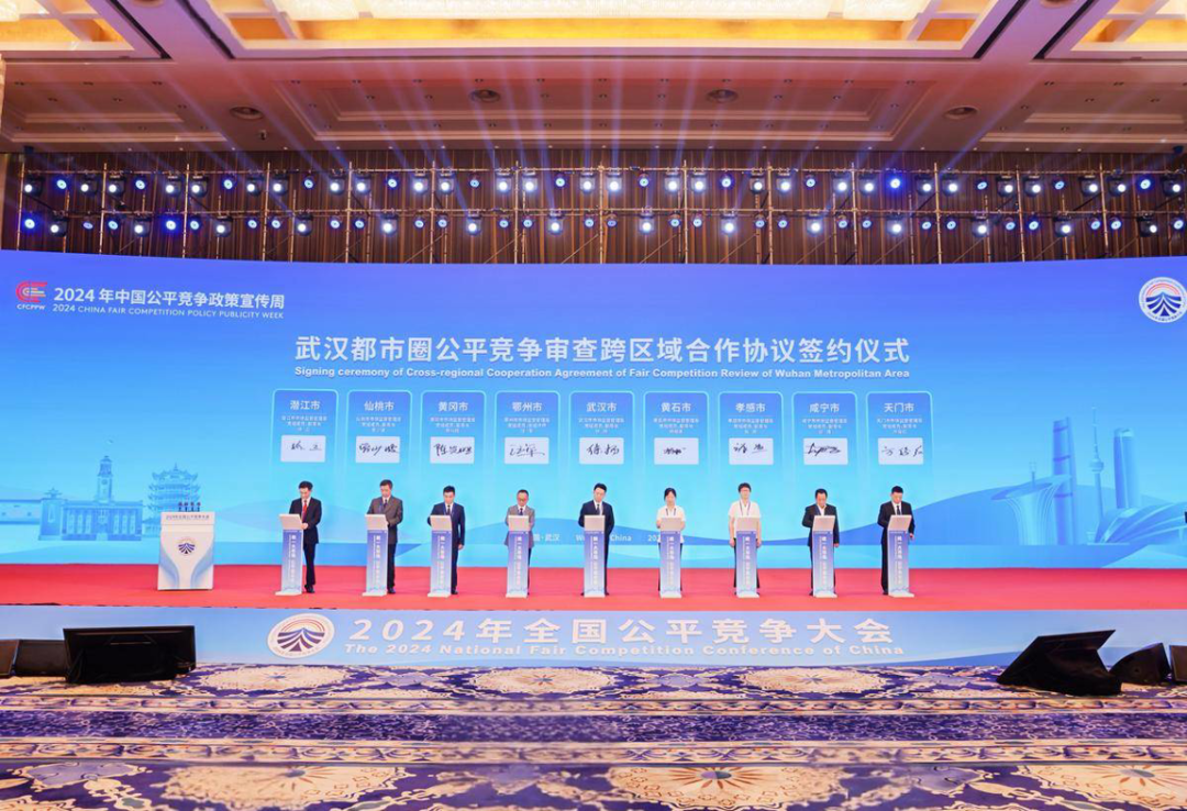 2024年9月10日至11日,由國家市場監(jiān)督管理總局主辦的2024年全國公平競爭大會在湖北省武漢市舉行,大會主題為“統(tǒng)一大市場 公平競未來”。圖為9月11日,武漢、黃石、鄂州、孝感、黃岡、咸寧、天門、仙桃、潛江等9個城市代表,現(xiàn)場簽訂公平競爭審查跨區(qū)域合作協(xié)議。? ?湖北省市場監(jiān)管局供圖
