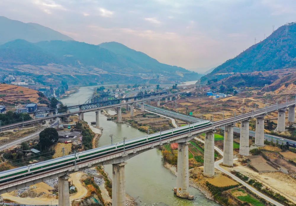 ?2022年12月26日,蜿蜒千里的新成昆鐵路全線貫通運(yùn)營(yíng)。復(fù)興號(hào)動(dòng)車組從成都南站發(fā)出,沿著現(xiàn)代化的鐵路,奔馳在崇山峻嶺間。