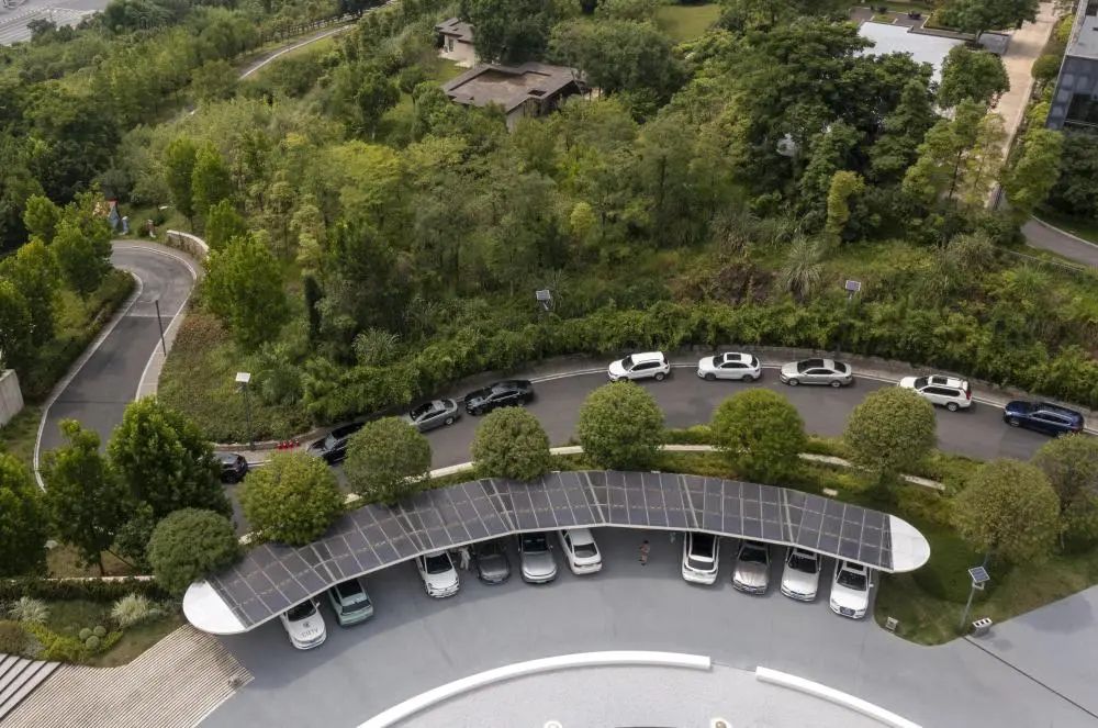?2022年6月16日拍攝的已建成投用的重慶首座光伏充電發(fā)用一體充電站(無(wú)人機(jī)照片)。新華社記者 劉潺 攝