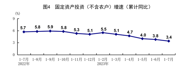 1-7月份,全國固定資產(chǎn)投資(不含農(nóng)戶)285898億元,同比增長3.4%。分領域看,基礎設施投資同比增長6.8%,制造業(yè)投資增長5.7%,房地產(chǎn)開發(fā)投資下降8.5%。全國商品房銷售面積66563萬平方米,同比下降6.5%;商品房銷售額70450億元,下降1.5%。分產(chǎn)業(yè)看,第一產(chǎn)業(yè)投資同比下降0.9%,第二產(chǎn)業(yè)投資增長8.5%,第三產(chǎn)業(yè)投資增長1.2%。民間投資下降0.5%。高技術產(chǎn)業(yè)投資同比增長11.5%,其中高技術制造業(yè)和高技術服務業(yè)投資分別增長11.5%、11.6%。高技術制造業(yè)中,醫(yī)療儀器設備及儀器儀表制造業(yè)、電子及通信設備制造業(yè)投資分別增長16.0%、13.9%;高技術服務業(yè)中,科技成果轉化服務業(yè)、專業(yè)技術服務業(yè)投資分別增長44.9%、23.8%。7月份,固定資產(chǎn)投資(不含農(nóng)戶)環(huán)比下降0.02%。