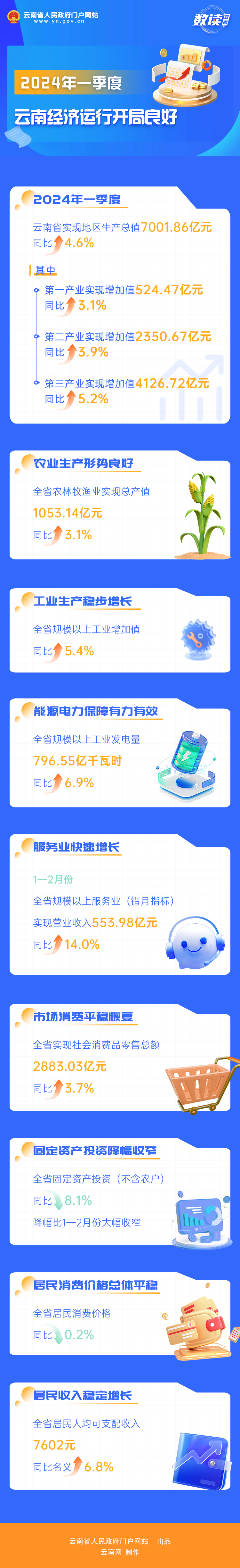 根據(jù)地區(qū)生產(chǎn)總值統(tǒng)一核算結(jié)果,2024年一季度云南省實(shí)現(xiàn)地區(qū)生產(chǎn)總值7001.86億元,同比增長4.6%。其中,第一產(chǎn)業(yè)實(shí)現(xiàn)增加值524.47億元,同比增長3.1%;第二產(chǎn)業(yè)實(shí)現(xiàn)增加值2350.67億元,增長3.9%;第三產(chǎn)業(yè)實(shí)現(xiàn)增加值4126.72億元,增長5.2%。
