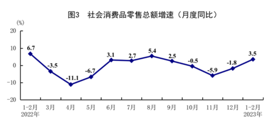 ?1-2月份,社會消費(fèi)品零售總額77067億元,同比增長3.5%,2022年12月份為下降1.8%;兩年平均增長5.1%。按經(jīng)營單位所在地分,城鎮(zhèn)消費(fèi)品零售額66796億元,同比增長3.4%;鄉(xiāng)村消費(fèi)品零售額10271億元,增長4.5%。按消費(fèi)類型分,商品零售68638億元,增長2.9%;餐飲收入8429億元,增長9.2%?;旧铑惿唐蜂N售較快增長,限額以上單位糧油食品類、服裝鞋帽針紡織品類商品零售額分別增長9.0%、5.4%;部分升級類商品銷售加快,限額以上單位金銀珠寶類、化妝品類商品零售額分別增長5.9%、3.8%。全國網(wǎng)上零售額20544億元,增長6.2%。其中,實(shí)物商品網(wǎng)上零售額17476億元,增長5.3%,占社會消費(fèi)品零售總額的比重為22.7%。從環(huán)比看,2月份社會消費(fèi)品零售總額比上月下降0.02%。