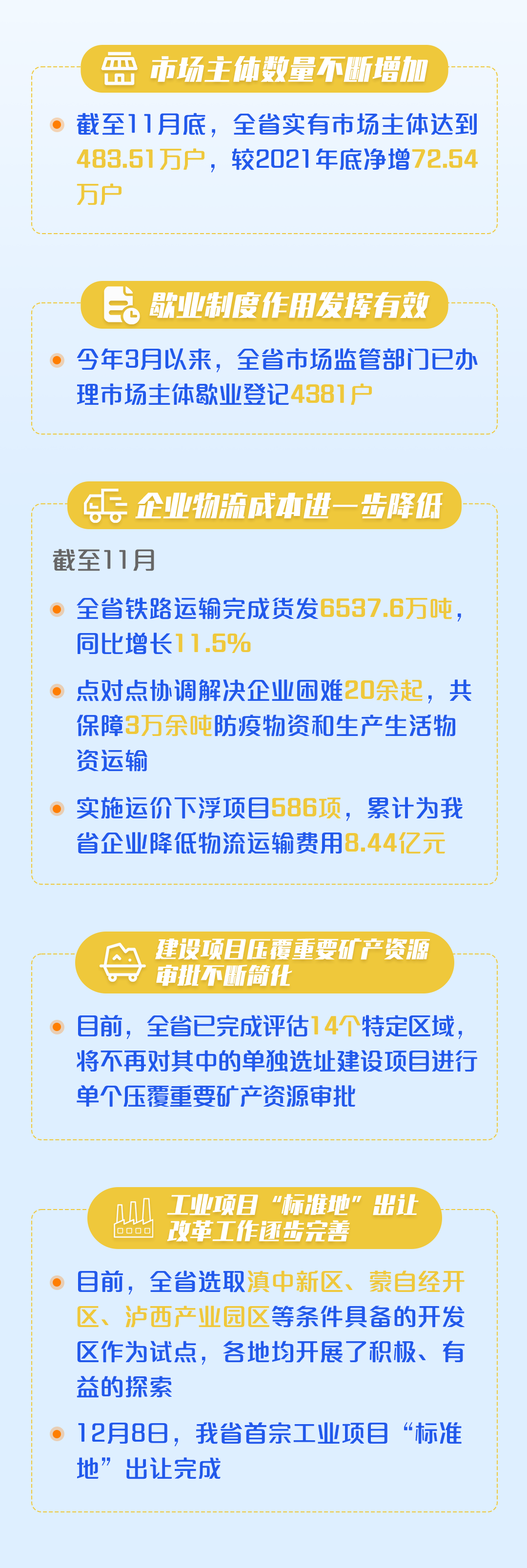 ?雖然我省優(yōu)化營(yíng)商環(huán)境工作取得了一定成效,但是當(dāng)前經(jīng)濟(jì)運(yùn)行面臨一些突出矛盾和問(wèn)題,市場(chǎng)主體特別是中小微企業(yè)、個(gè)體工商戶(hù)生產(chǎn)經(jīng)營(yíng)困難依然較多。10月19日,云南省人民政府辦公廳印發(fā)了《關(guān)于進(jìn)一步優(yōu)化營(yíng)商環(huán)境降低市場(chǎng)主體制度性交易成本的若干措施的通知》,推動(dòng)降低市場(chǎng)主體準(zhǔn)入成本、推動(dòng)減輕市場(chǎng)主體經(jīng)營(yíng)負(fù)擔(dān)、推動(dòng)降低市場(chǎng)主體辦事成本、切實(shí)保護(hù)市場(chǎng)主體合法權(quán)益、切實(shí)穩(wěn)定市場(chǎng)主體政策預(yù)期,幫助市場(chǎng)主體解難題、渡難關(guān)、復(fù)元?dú)?、增活力,加力鞏固?jīng)濟(jì)恢復(fù)發(fā)展基礎(chǔ)。