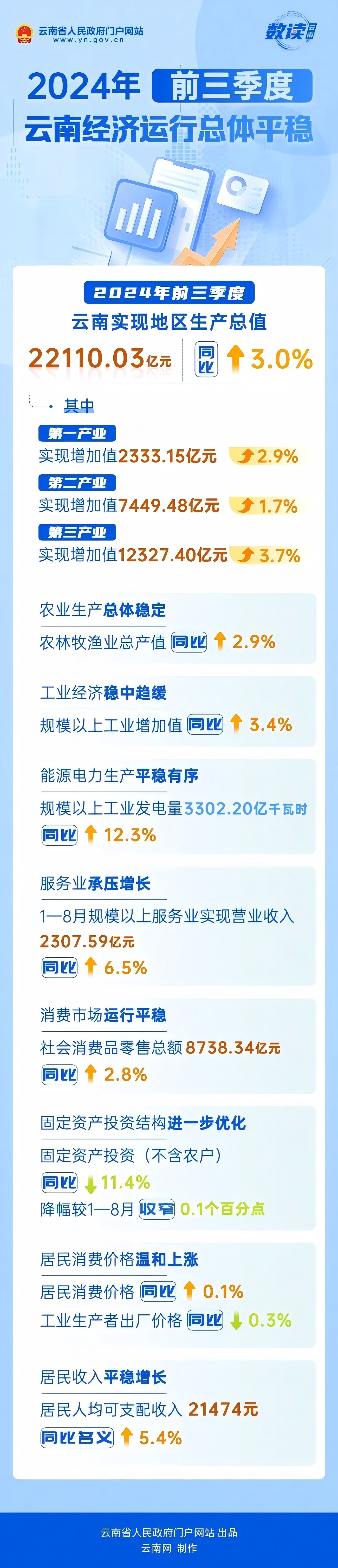 根據(jù)地區(qū)生產(chǎn)總值統(tǒng)一核算結(jié)果,2024年前三季度全省實(shí)現(xiàn)地區(qū)生產(chǎn)總值22110.03億元,同比增長(zhǎng)3.0%。其中,第一產(chǎn)業(yè)實(shí)現(xiàn)增加值2333.15億元,同比增長(zhǎng)2.9%;第二產(chǎn)業(yè)實(shí)現(xiàn)增加值7449.48億元,增長(zhǎng)1.7%;第三產(chǎn)業(yè)實(shí)現(xiàn)增加值12327.40億元,增長(zhǎng)3.7%。