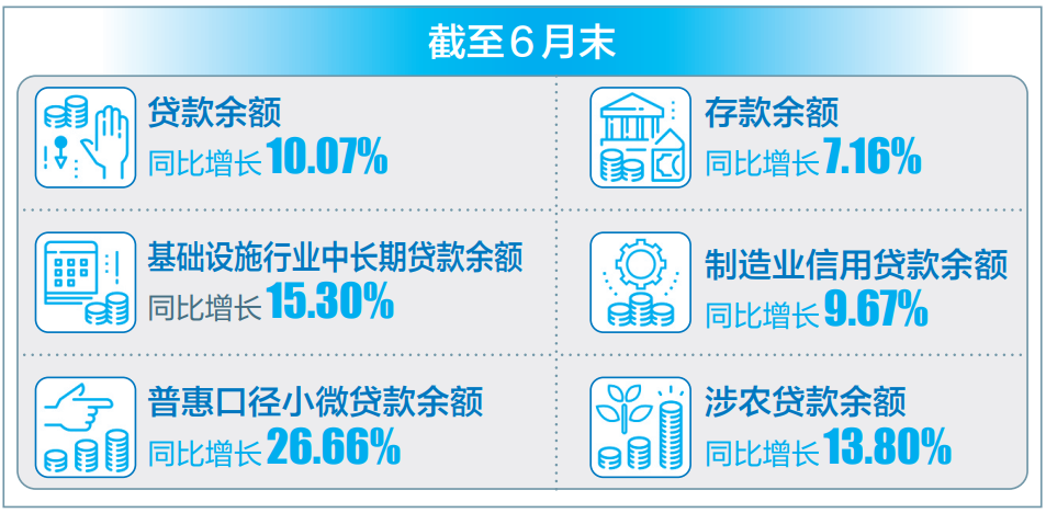 聚焦有效投資及重點領(lǐng)域,截至6月末,全省基礎(chǔ)設(shè)施行業(yè)中長期貸款余額1.06萬億元,同比增長15.30%;涉農(nóng)貸款余額1.38萬億元,同比增長13.80%;綠色貸款余額4510.97億元,同比增長24.72%;制造業(yè)信用貸款余額846.39億元,同比增長9.67%,占制造業(yè)貸款的比重為47.98%。
