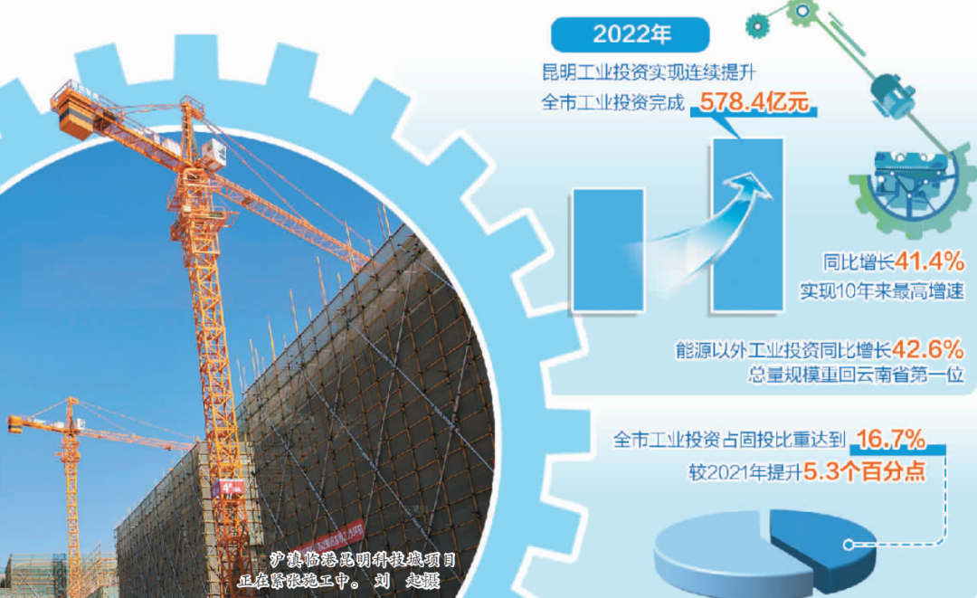 一年間,昆明工業(yè)投資實(shí)現(xiàn)連續(xù)提升,全市工業(yè)投資完成578.4億元,同比增長(zhǎng)41.4%,實(shí)現(xiàn)10年來最高增速;占全市固投比重達(dá)到16.7%,較2021年提升5.3個(gè)百分點(diǎn);特別是能源以外工業(yè)投資同比增長(zhǎng)42.6%,總量規(guī)模重回云南省第一位。