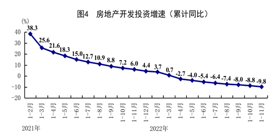 ?1-11月份,全國(guó)固定資產(chǎn)投資(不含農(nóng)戶)520043億元,同比增長(zhǎng)5.3%。分領(lǐng)域看,基礎(chǔ)設(shè)施投資同比增長(zhǎng)8.9%,制造業(yè)投資增長(zhǎng)9.3%,房地產(chǎn)開發(fā)投資下降9.8%。全國(guó)商品房銷售面積121250萬平方米,同比下降23.3%;商品房銷售額118648億元,下降26.6%。分產(chǎn)業(yè)看,第一產(chǎn)業(yè)投資同比增長(zhǎng)0.7%,第二產(chǎn)業(yè)投資增長(zhǎng)10.1%,第三產(chǎn)業(yè)投資增長(zhǎng)3.2%。民間投資增長(zhǎng)1.1%。高技術(shù)產(chǎn)業(yè)投資增長(zhǎng)19.9%,其中高技術(shù)制造業(yè)和高技術(shù)服務(wù)業(yè)投資分別增長(zhǎng)23.0%、13.2%。高技術(shù)制造業(yè)中,醫(yī)療儀器設(shè)備及儀器儀表制造業(yè)、電子及通信設(shè)備制造業(yè)投資分別增長(zhǎng)28.3%、28.2%;高技術(shù)服務(wù)業(yè)中,科技成果轉(zhuǎn)化服務(wù)業(yè)、電子商務(wù)服務(wù)業(yè)、研發(fā)設(shè)計(jì)服務(wù)業(yè)投資分別增長(zhǎng)26.1%、24.4%、21.2%。社會(huì)領(lǐng)域投資增長(zhǎng)12.5%,其中衛(wèi)生、教育投資分別增長(zhǎng)29.3%、7.5%。11月份,固定資產(chǎn)投資(不含農(nóng)戶)環(huán)比下降0.87%。